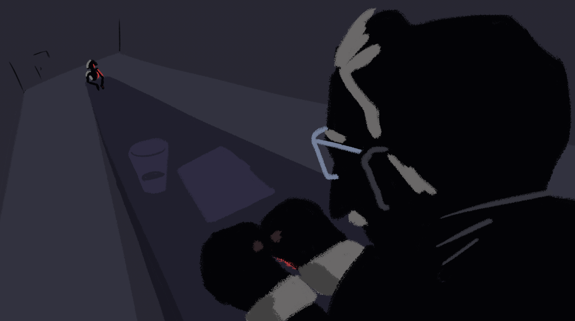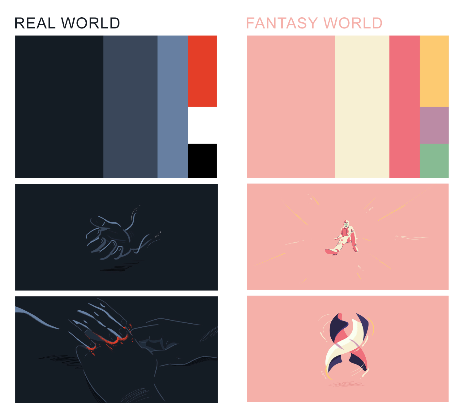 For this animation, we thought about how a visually impaired person can perceive the world through their touch sense, and how important are the shapes and the textures as the way to learn about the world. That's why we thought of a narrative where the most important thing was to represent the feelings of our main character through a simplified color palette and minimum amount of shapes that could create visual metaphors that could be transformed from one moment to another, flowing through his own dialogue.